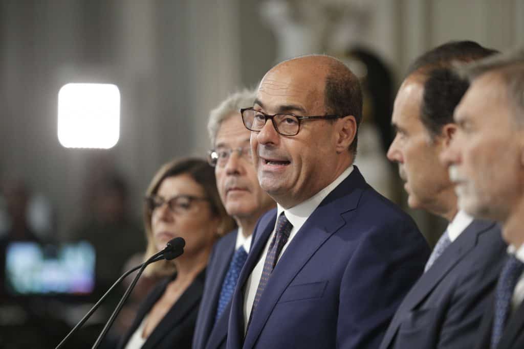 PD-leder Nicola Zingaretti (i midten) møtte pressen etter samtalene med president Sergio Mattarella i Quirinale-palasset i Roma onsdag. Foto: Andrew Medichini / AP / NTB scanpix