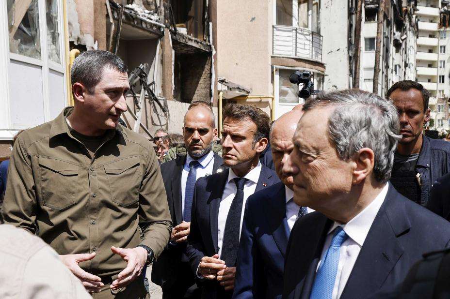 Frankrikes president ble sammen med Tysklands statsminister Olaf Scholz, Italias statsminister Mario Draghi og Romanias president Klaus Iohannis vist rundt i forstaden torsdag.