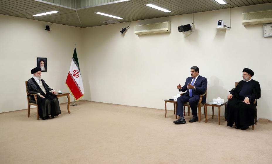 Venezuelas president Nicolás Maduro møtte den åndelige lederen ayatolla Ali Khamenei (til venstre) da han i helgen besøkte Iran. Til høyre president Ebrahim Raisi. Foto: Kontoret til Irans åndelige leder / AP / NTB
