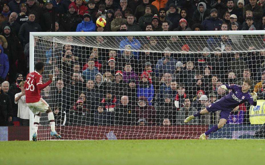 Manchester United-talentet Anthony Elanga satte ballen over mål i straffesparkkonkurransen mot Middlesbrough i FA-cupen. Bommen sendte United ut av turneringen etter totalt 16 spark fra krittmerket. Foto: Jon Super / AP / NTB