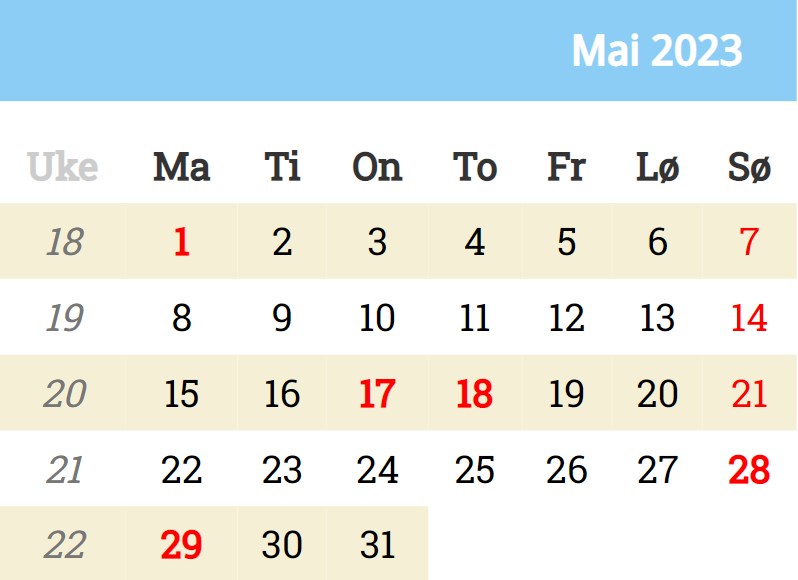 1.5: Offentlig høytidsdag, 17.5: Grunnlovsdag, 18.5: Kristi Himmelfartsdag, 28.5: 1. pinsedag, 29.5: 2. pinsedag. Skjermbilde fra Norsk Kalender på nett.