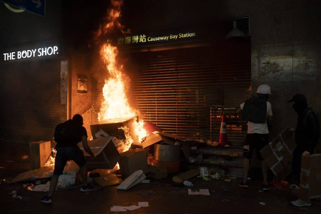 Demonstranter satte fyr på pappesker utenfor Causeway Bay Subway i Hongkong fredag kveld. Foto: Felipe Dana / AP / NTB scanpix