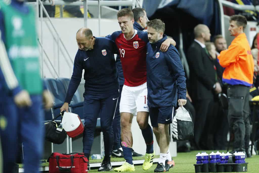 En skadet Markus Henriksen må forlate banen under EM-kvalifiseringskampen i fotball mellom Sverige og Norge på Friends Arena i Stockholm. Foto: Stian Lysberg Solum / NTB scanpix