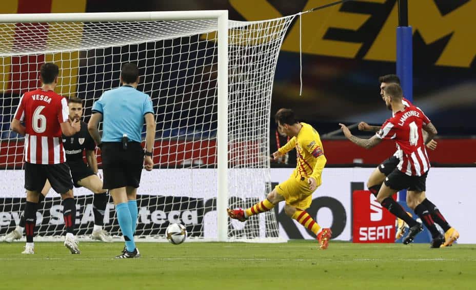 Barcelona dominerte kampen og var nær scoring allerede i det 4. minutt, men de Jong traff stolpen etter forarbeid av Messi. Athletic-keeper Unai Simon måtte ta fram flotte redninger for å nekte Griezmann og Sergio Busquets scoring, men da nullen først sprakk så flommet målene inn.