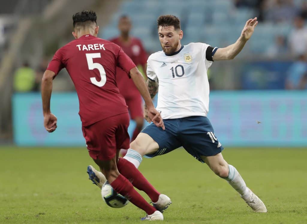 Argentina og Lionel Messi (høyre) i duell med Qatars Tarek Salman i Copa America søndag. Argentina vant 2–0 og sikret spill i utslagsrundene. Foto: AP Photo / Silvia Izquierdo / NTB scanpix.