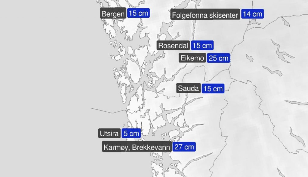 Snøvær: Tirsdag formiddag var det fortsatt Karmøy som hadde mest snø. Da ble det målt 27 cm på Brekke.