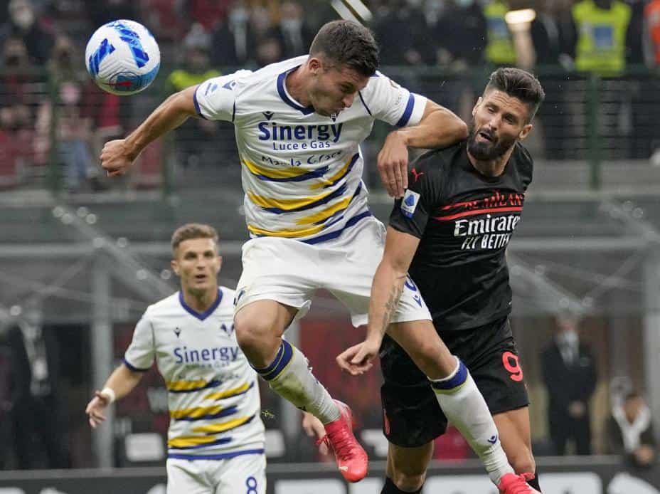 Olivier Giroud startet opphentingen som endte med 3-2-seier for Milan over Hellas Verona lørdag kveld. Storklubben overnatter på tabelltoppen i Serie A.