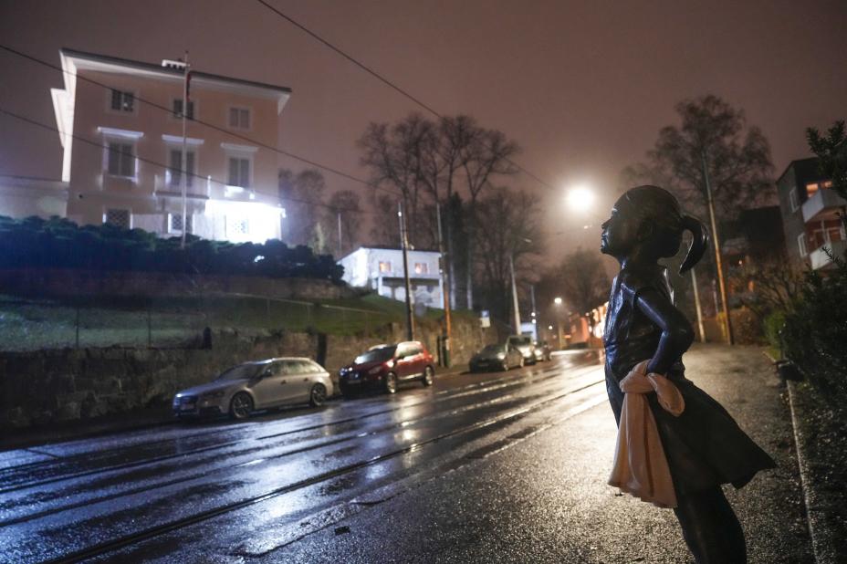 Statuen «Fearless Girl» står vanligvis utenfor Grand Hotel i Oslo. Nå har Christian Ringnes plassert kunstverk på fortauet i Drammensveien utenfor den iranske ambassaden, med en hijab i hånden. Foto: Javad Parsa / NTB