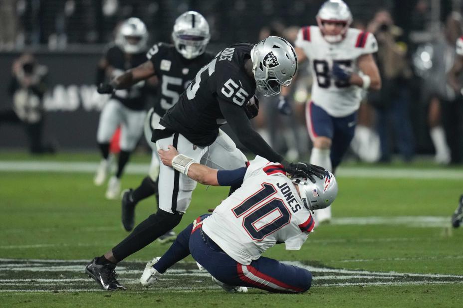 Patriots hadde ballen med stillingen 24-24, men i jakten på vinnerpoengene tok laget for store sjanser. Jakobi Meyers kastet en tversoverpasning som havnet i hendene på Raiders-forsvarer Chandler Jones, og han viftet vekk taklingsforsøket fra quarterback Mac Jones på vei mot touchdown fra 48 yards.