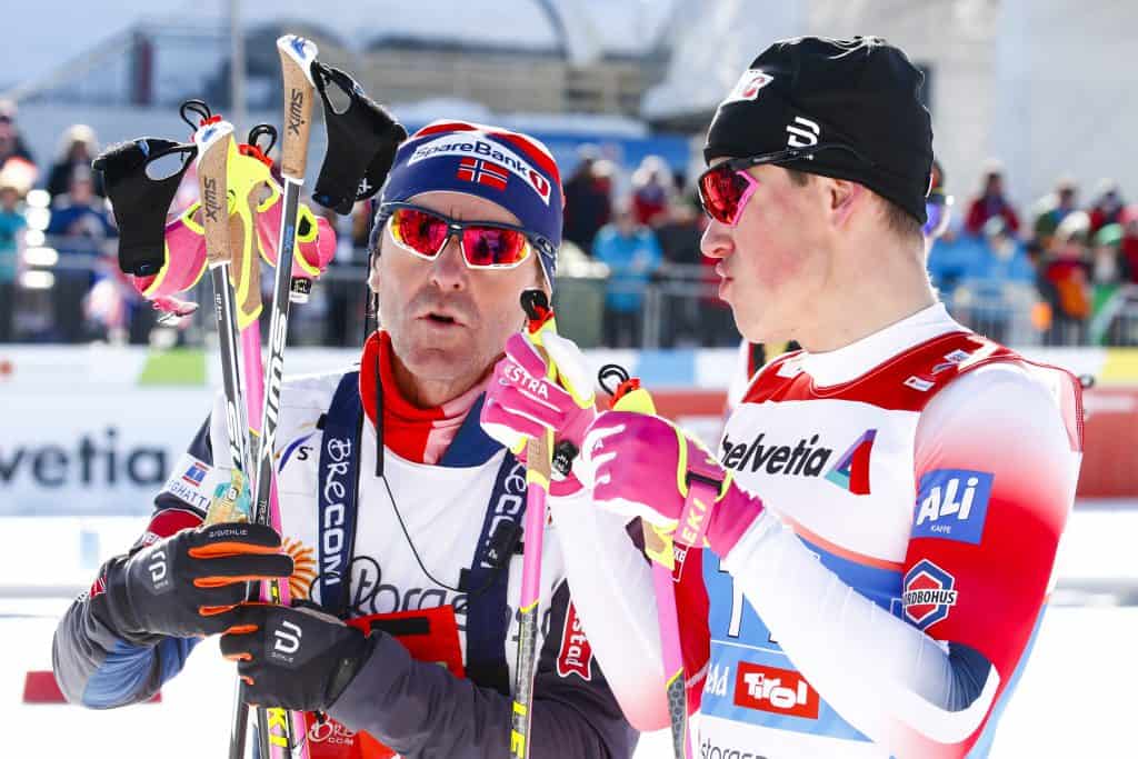 Sprintlandslagstrener Arild Monsen (til venstre) og Johannes Høsflot Klæbo diskuterer i semifinalen i VM søndag. Foto: Terje Pedersen / NTB scanpix