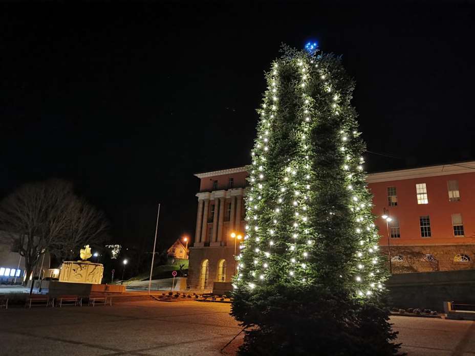 Nå står treet pyntet til jul på Rådhusplassen i Haugesund.