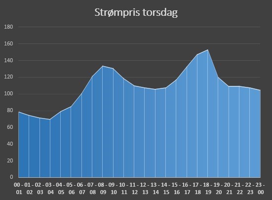 Lavere temperaturer og mindre vind gir oss høyere strømpriser igjen. Snittprisen blir 108 øre. Snittprisen torsdag var på 47 øre, mot 27 øre per kWt onsdag og 52 øre mandag og tirsdag.