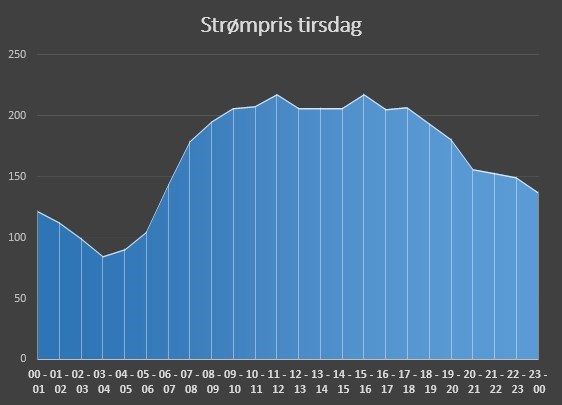 Tirsdag er snittprisen på 166 øre, mens maksprisen er på 204 øre og laveste pris er på 85 øre.