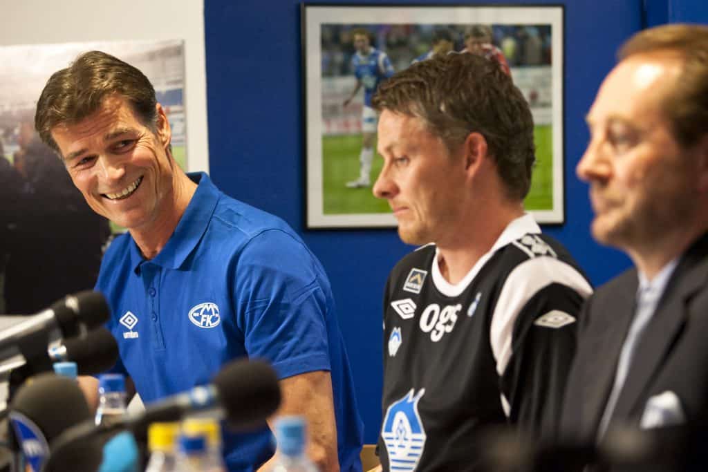 Øystein Neerland (t.v.) slutter som daglig leder i Molde Fotball AS og Molde FK ved årsskiftet. Her sammen med daværende Molde-manager Ole Gunnar Solskjær og Molde-investor Kjell Inge Røkke i 2012. Foto: Svein Ove Ekornesvåg / NTB scanpix