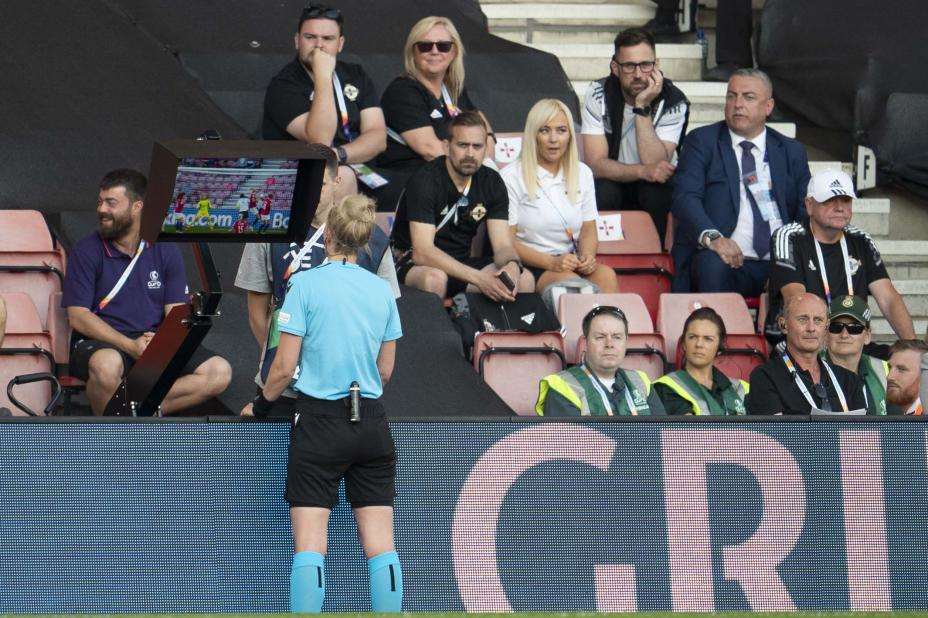 Lina Lehtovaara ved VAR-monitoren der hun ble overbevist om at Norge skulle ha straffespark mot Nord-Irland. Foto: Terje Pedersen / NTB