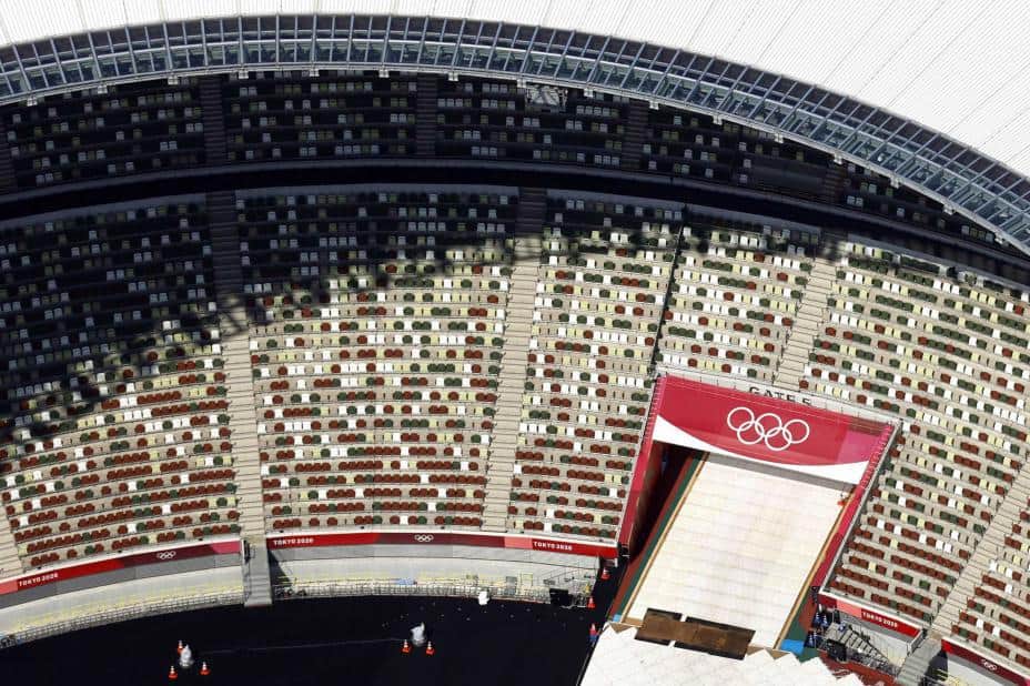 OL-stadion i Tokyo kommer til å være uten tilskuere under åpningsseremonien fredag. Foto: Kyodo News via AP / NTB