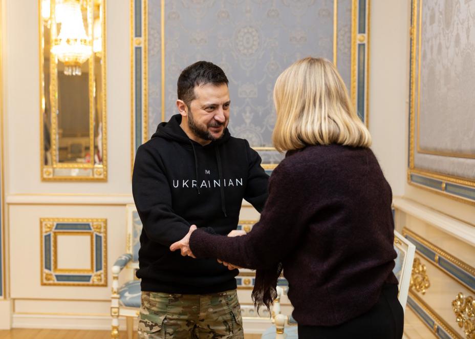 Utenriksminister Anniken Huitfeldt (Ap) møtte mandag Ukrainas president Volodymyr Zelenskyj under et besøk i Kyiv. Tirsdag deltar hun på møter både i regi av Nato og G7-gruppen. Foto: Kiur Kaasik / NTB