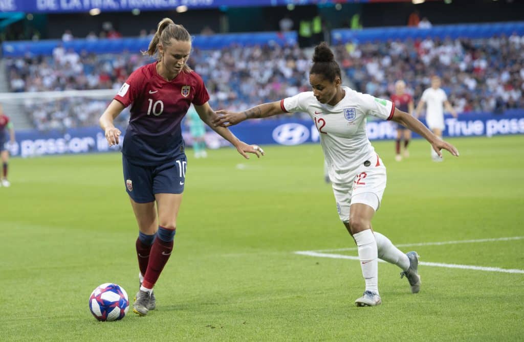 Norges Caroline Graham Hansen mot Demi Stokes i kvartfinalen i VM mot England på Stade Océane. Foto: Terje Bendiksby / NTB scanpix.