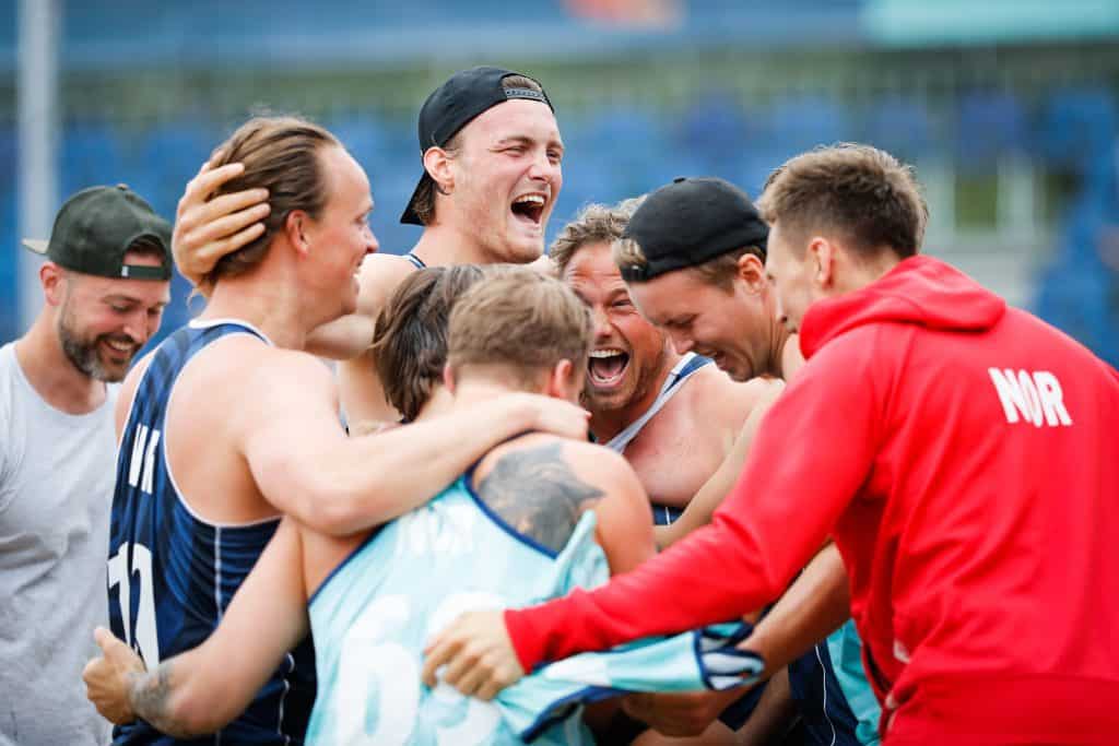 Norge jubler for seier på vei mot EM-finalen i sandhåndball i Polen. Foto: Uros Hocevar / EHF / NTB scanpix
