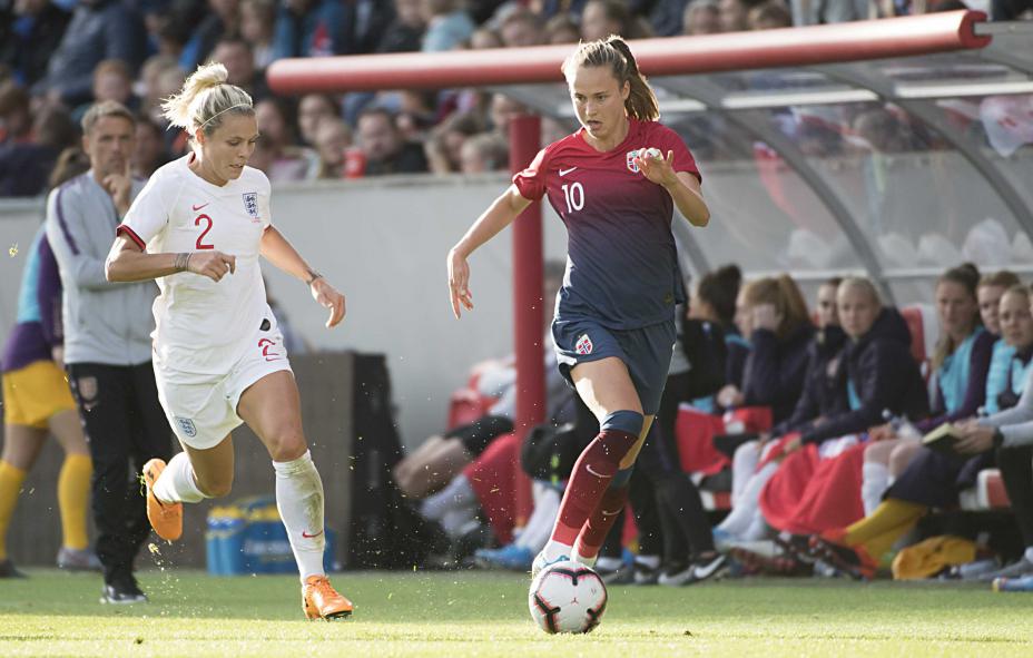 Rachel Daly (til v.) scoret i Englands EM-oppkjøringskamp mot Belgia. Her er hun i aksjon mot Caroline Graham Hansen i en kamp mot Norge, som blir motstander også i sommerens sluttspill. Foto: Marit Hommedal / NTB