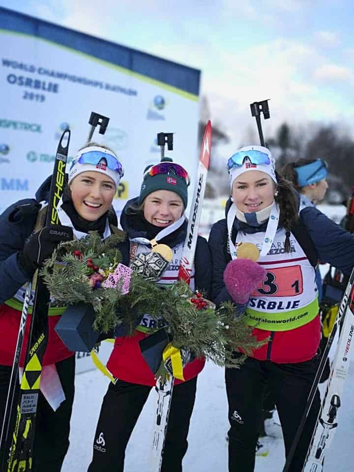 Maren Bakken (til h.) vant gull og Marte Møller (i midten) bronse, mens Anne de Besche (til v.) ble nummer fem på sprinten i ungdoms-VM skiskyting fredag. Her er de etter tirsdagens stafettgull. Foto: Norges Skiskytterforbund / NTB scanpix