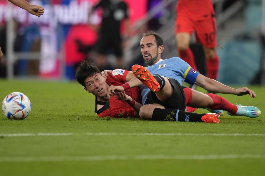 Sør-Koreas Hwang Ui-jo (til venstre) mot Diego Godin og Uruguay under VM-kampen i fotball. Foto: Frank Augstein, AP / NTB