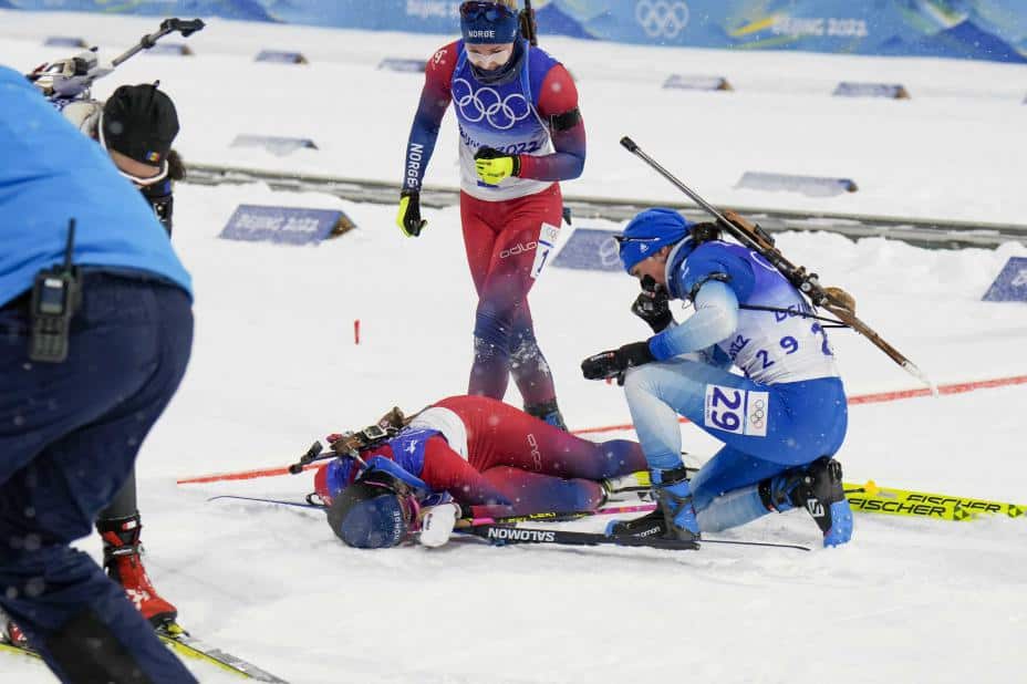Sport: Tandrevold sank sammen i det hun passerte mållinjen som nummer 14. Både utøvere og støtteapparat styrtet til for å hjelpe henne med å få av seg utstyret. Deretter ble hun støttet bort fra målområdet.