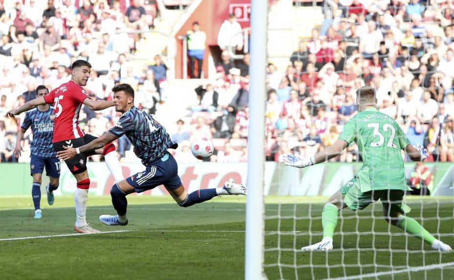 Bukayo Saka var frisk hos gjestene og kom til gode skuddmuligheter, men ble også han ble stoppet av Saints’ bakerste mann.