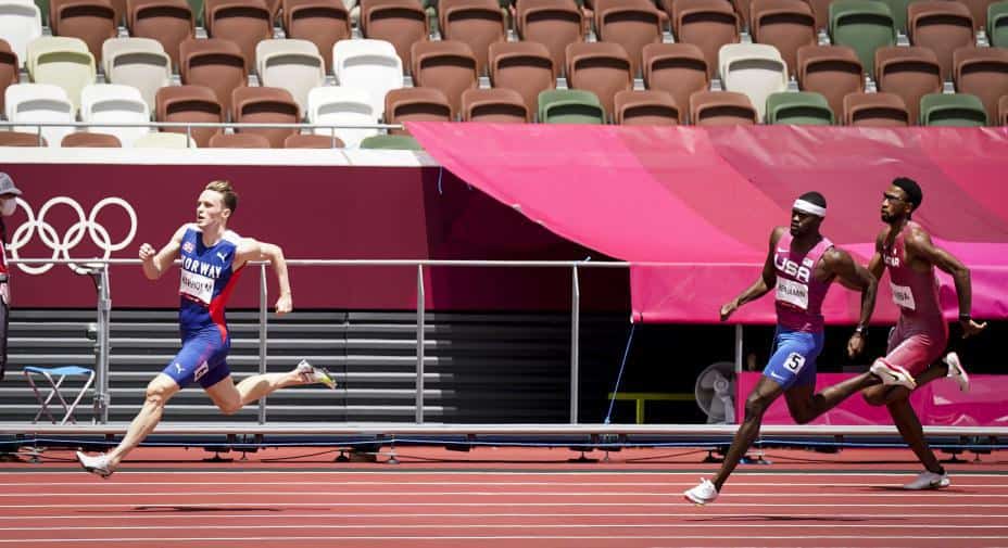 Karsten Warholm nærmest flyr over friidrettsdekket i Tokyo på vei mot verdensrekord og OL-gull. Den japanske banen kan være tidenes raskeste. Foto: Lise Åserud / NTB