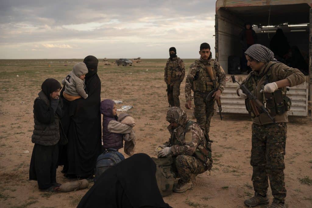 Kvinner og barn evakueres av SDF-soldater i ørkenen utenfor Baghouz onsdag denne uken. Foto: /Felipe Dana / AP / NTB scanpix
