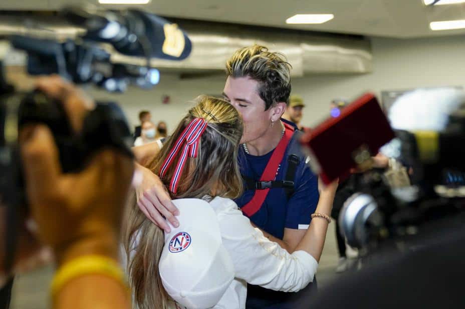 Da gullhelten kom kastet han munnbindet for å gi forloveden et kyss, før storebror fikk en klem og gullmedaljen ble funnet fram. Forloveden hadde med seg en egen gulljakke til OL-vinneren også, som han tok på seg før han gjorde intervjuene.