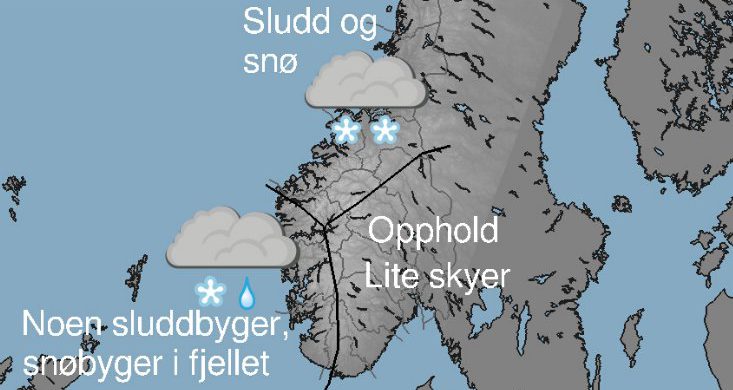 Regn, senere regnbyger, snø i fjellet. Om kvelden overgang til sluddbyger og snøbyger, regnbyger på kysten.