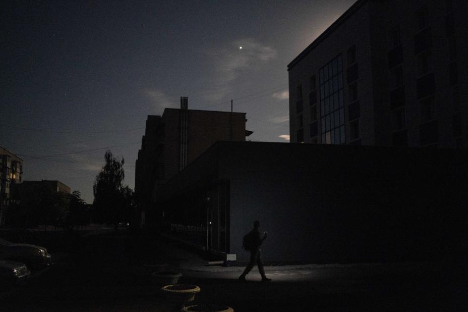 En mann utenfor et hotell i byen Pokrovsk etter at kraftige eksplosjoner ble hørt under et russisk angrep sent lørdag. Foto: Leo Correa / AP / NTB