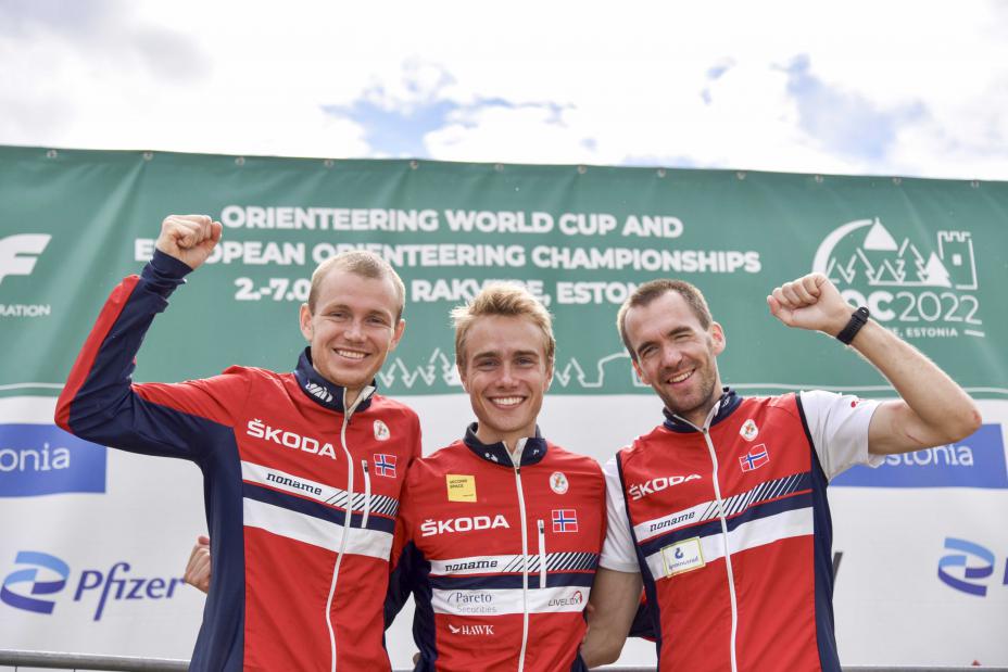 Eskil Kinneberg (f.v.), Kasper Fosser og Magne Dæhli vant EM-stafetten i orientering i Estland. Foto: Norges Orienteringsforbund / NTB