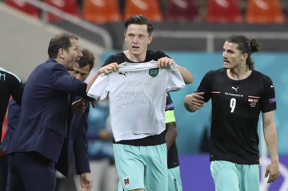 Marcel Sabitzer serverte Stefan Lainer med en nydelig crosspasning etter 18 minutter, og høyrebacken sendte ballen i mål med en flygende volley. Den flotte scoringen ble feiret ved å holde opp en drakt med påskriften «Eriksen Stay Strong» til hyllest for Christian Eriksen etter at dansken overlevde et hjertestopp dagen før.