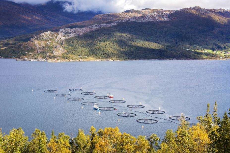 Sjømatnæringen er blant Norges viktigste distriktsnæringer og næringen har størst betydning for verdiskaping og sysselsetting i Vest- og Nord-Norge. Her fra et anlegg for lakseoppdrett med i Sjona, på Helgelandskysten. Foto: Gorm Kallestad / NTB