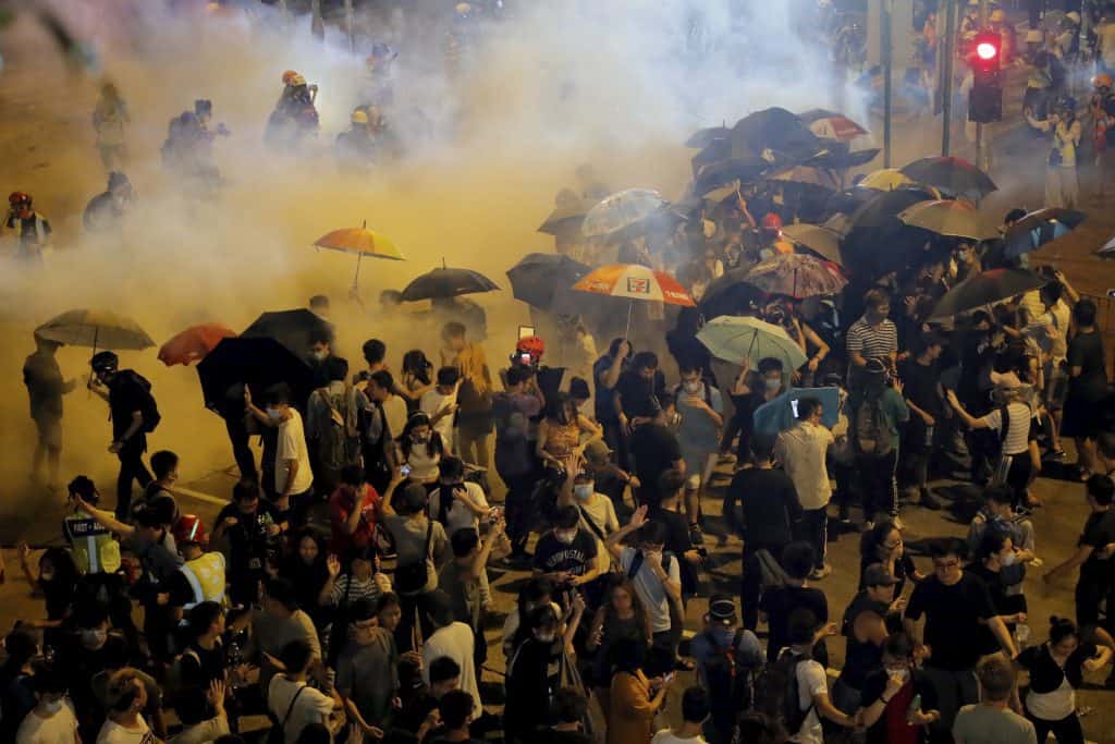 Politiet avfyrte tåregass mot en folkemengde i Wong Tai Sin-distriktet i Hongkong lørdag. Foto: Kin Cheung / AP / NTB scanpix
