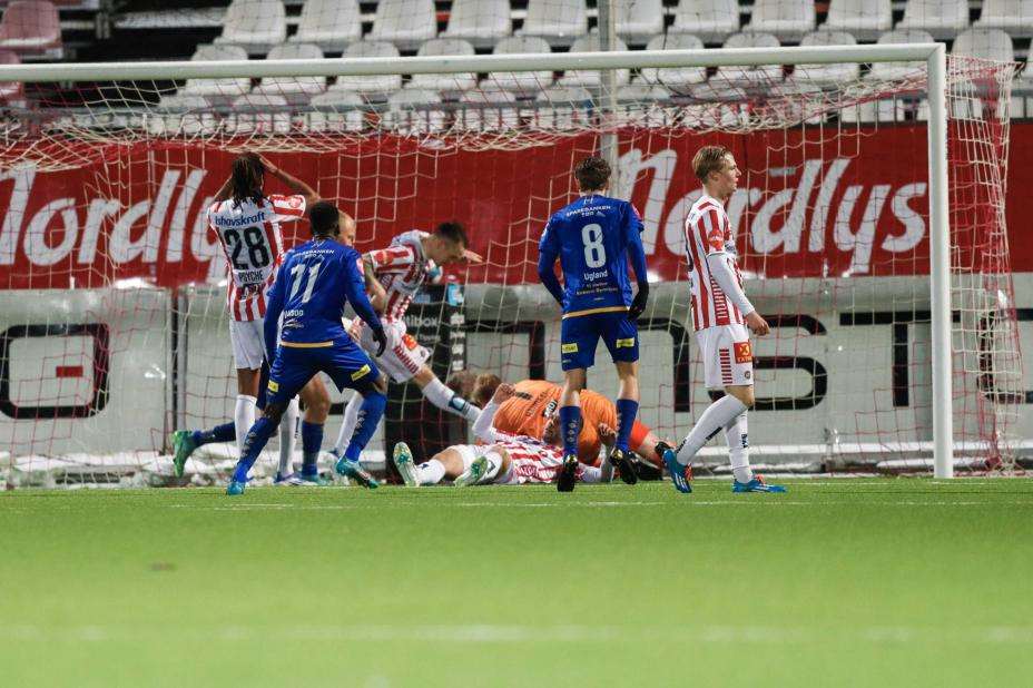 Det ble ingen stor første omgang i Tromsø. Jervs Erik Brenden var nær scoring med en heading, og Opsahl holdt på å rote det til i en annen situasjon.
