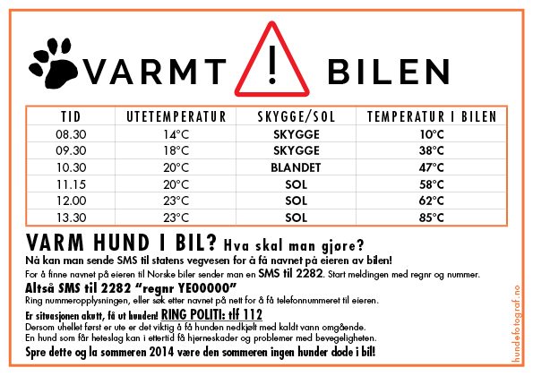 Dersom du ser en hund som sitter innesperret i varm bil, må du forsøke å lokalisere bilens eier. Dette kan du gjøre via SMS til Statens vegvesen. Tast inn REGNR (mellomrom) og registreringsnummer, og send meldingen til 2282 (eksempel REGNR AJ29347). Hvis du ikke får tak i bilens eier, må du kontakte politiet på telefon 02800. Dersom dyret lider og du verken oppnår kontakt med eier, politi eller Mattilsynet kan du ta deg inn i bilen for å hjelpe ut dyret.