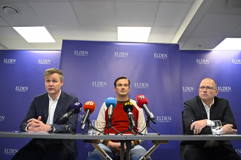 Forsvarer Bernt Heiberg, Andrey Yakunin og forsvarer Jens Bernhard Herstad under pressekonferansen om den dronetiltalte og frikjente Andrey Yakunin på Elden advokatfirma i Oslo. Foto: Annika Byrde / NTB