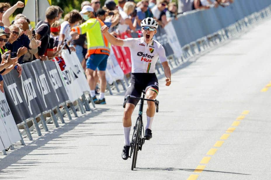 Per Strand Hagenes fra Sandnes sykkelklubb tok fredag gull i fellesstart i VM i Belgia. Her fra fellesstart junior under sykkel-NM 2021 i Vennesla. Foto: Tor Erik Schrøder / NTB