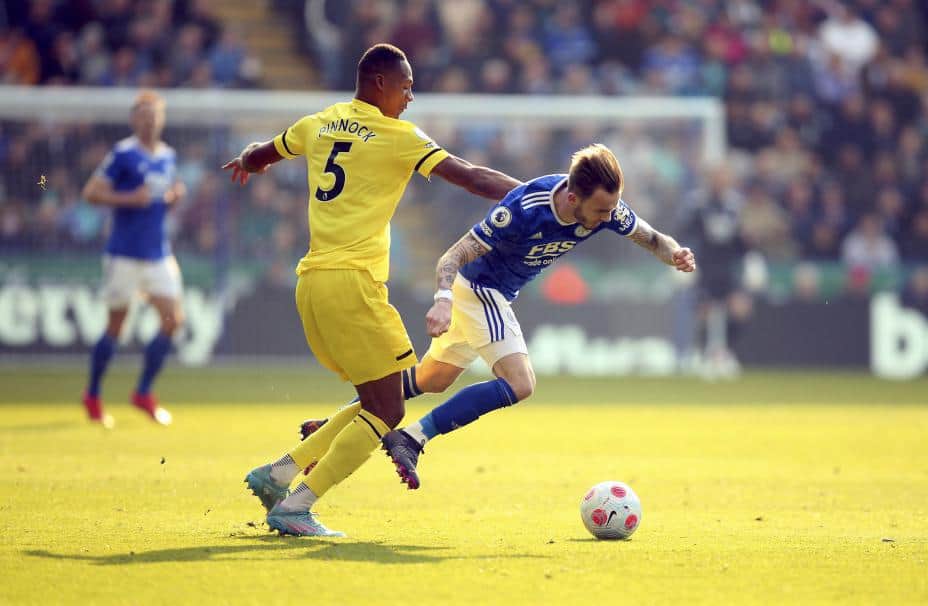 Leicesters Timothy Castagne og James Maddison vartet opp med hvert sitt kremmerhus da Brentford ble slått 2-1 i Premier League søndag.