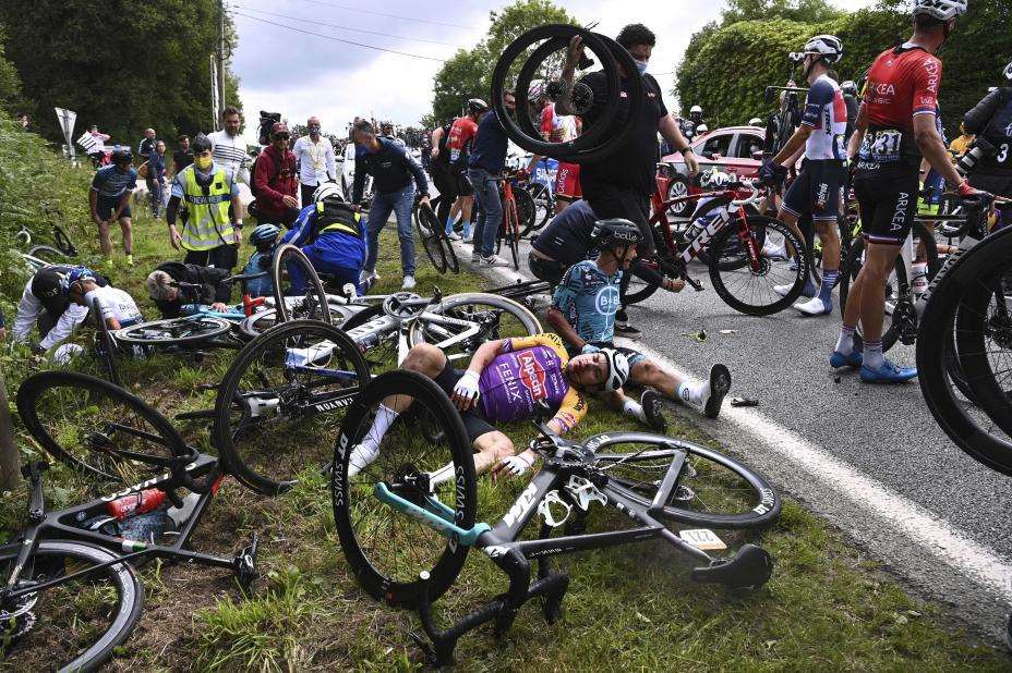 Deretter fulgte en enorm kjedekollisjon gjennom feltet. Det ble full stopp, og i alt 21 ryttere fikk konstatert skader som følge av velten.