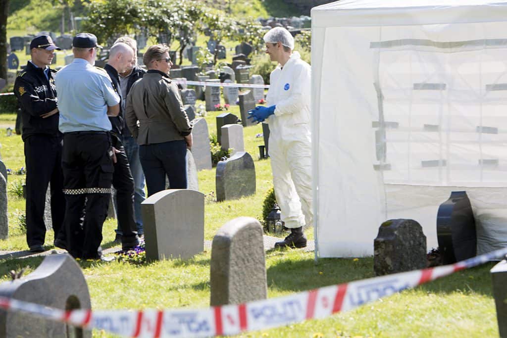 Politiet i arbeid på Øvsttun gravplass i Bergen tidligere i år. Nå skal det gjøres nye søk. Foto: Marit Hommedal / NTB scanpix
