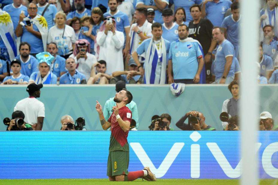 Bruno Fernandes skjøt Portugal til åttedelsfinale og ødela kvelden for Uruguay-fansen på stadion i Lusail. Foto: Petr David Josek / AP / NTB