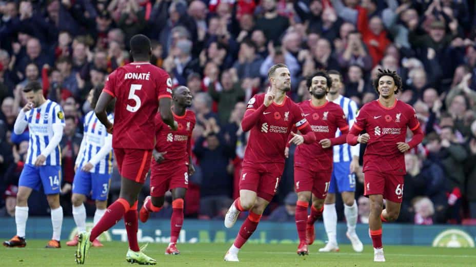 Jordan Henderson jubler for scoring for Liverpool. Premier League får en tidligere oppstart neste sesong. Foto: Jon Super / AP / NTB