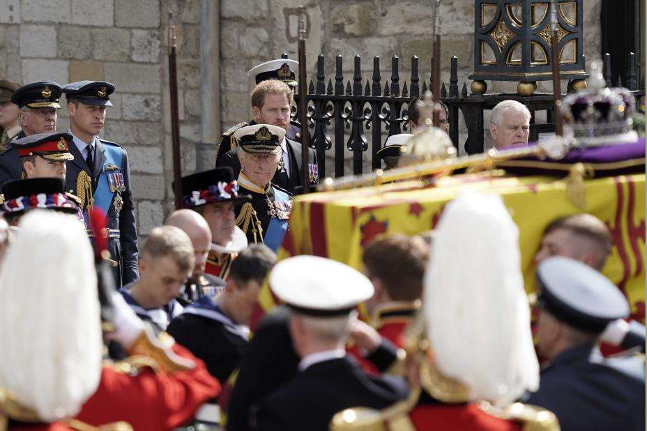 Langs ferden mellom Westminster Hall og Westminster Abbey har folket samlet seg for å få et glimt av kisten til sin monark gjennom 70 år. Oppå kisten ligger dronningens riksregalier, og en bukett fra hennes eldste sønn og arving, kong Charles.