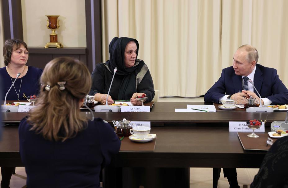 I den regisserte seansen i Putins residens deltok 17 kvinner. En av kvinnene bar et sort sjal for å markere tapet av sønnen. Putin sa at han kondolerte til kvinnen.