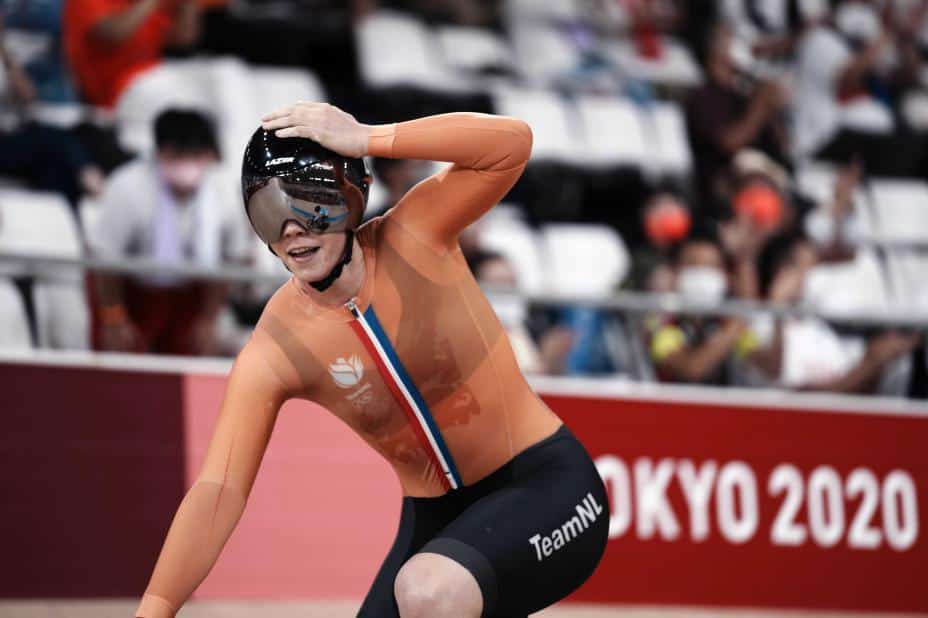 Den nederlandske 30-åringen var først over mål i kvinnenes OL-finale i keirin, en øvelse der rytterne i feltet ligger bak en e-motorsykkel som pacer dem i stadig større hastighet, og så er det tre runders spurt hvor det handler om å være først i mål.