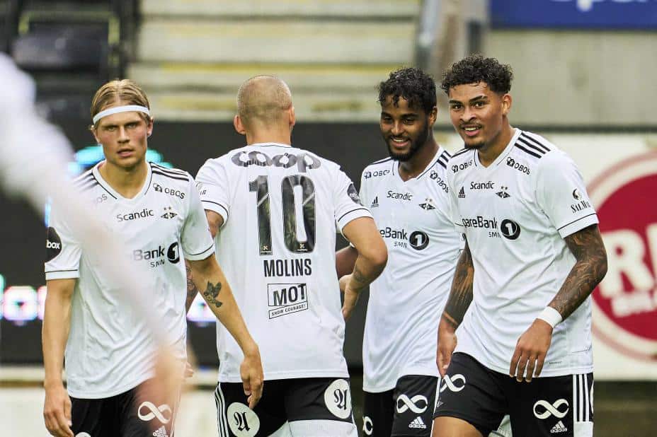Emil Konradsen Ceïde (nummer to fra høyre) og Noah Holm (til høyre) under en RBK-kamp. De to herjet for U21-landslaget tirsdag. Foto: Ole Martin Wold / NTB